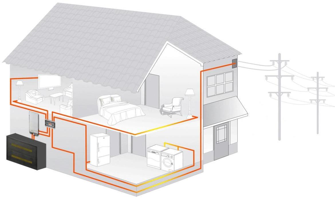 The best of all worlds – this system comprises solar power with battery backup and all excess power generated by the solar panels is returned to the grid. Smart inverters can be programmed to use battery power during municipality peak tariff times. In the ultimate hybrid configuration, power can be generated by solar panels, wind turbines, diesel generator or mains, alone or in any combination.